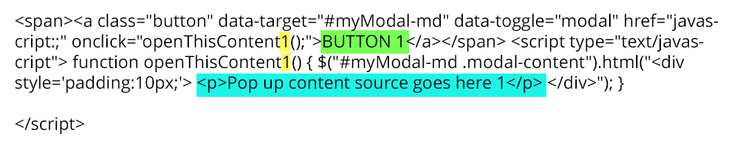 How this works: The image of the string of code below represents "button 1" at the top of this page. This all has to be set up within the page source. If you have more than one popup on a page (section) you have to create separate functions for each, essentially just rename it. Something like "openThisContentWhyConnect ();" - it is important to note that whatever you name it, it will have to be the same in both locations (see both highlighted "1"s in the image below). You can chenge the button text by changing the "Button 1" text. The conent itself goes where I have the "Pop up content source goes here 1". It doesn't show up anywhere on the page itself, so you can't do much formatting within the editor. It may be easier to format the content on another page then copy/paste the source code. It is VERY finicky. I had to condense it all to a single line, define a h7 to get red text (yours browser is likely cached from before that update), and I haven't been able to any of the content within the popup. but it does technically work. - I don't love the idea of this in practice for a few reasons; mostly because a significant majority of users will not interact with those clickable elements at all, essentially hiding the content that they want users to read (should just be front and center like it is now).